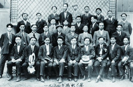 1924年7月,旅欧中国共产主义青年团第五次代表大会代表在巴黎的合影(前排左起:1为聂荣臻,2为李林,4为周恩来,5为刘伯庄,6为李富春,8为傅烈;二排:1为柳溥清,2为林蔚,4为任卓宣,5为周唯桢;三排:2为余增生,5为方志刚,6为李卓然;后排:1为穆青,5为邓小平)