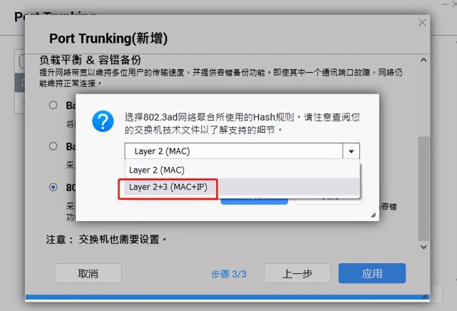 802.3ad Trunking的Hash规则选择【Layer 2+3 (MAC+IP)】,点击【应用】。