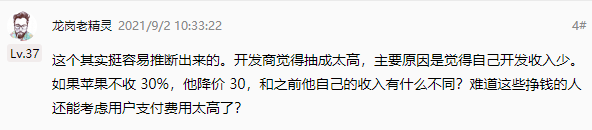 当然,也有机智的网友分析:倘若苹果真的不收那 30% 佣金后,那么开发者也会跟着降价,让用户付款时少 30% 吗?那果子就不知道了,毕竟开发者那么多,很难保证所有人都愿意跟着降价。原因很简单,开发商觉得抽成太高,主要原因是觉得自己开发收入少。如果苹果不收 30%,他降价 30,和之前他自己的收入有什么不同?难道这些挣钱的人还能考虑用户支付费用太高了?