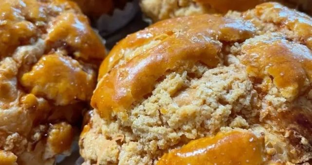 这款奶酥菠萝包的表层是熟杏仁片,表皮已经被烤得焦酥,里面还是软绵的,夹心是黄油椰蓉馅儿,吃起来很有层次感,搭配早餐奶,开启一天的元气满满。