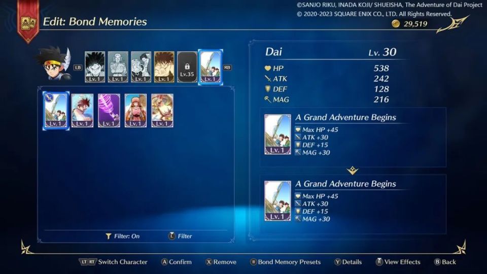 SE今日发布本作角色强化要素「羁绊记忆」介绍。羁绊记忆可以通过推进故事模式或攻略记忆神殿来获得。全都使用了漫画《勇者斗恶龙达伊的大冒险》中的经典场面。让角色装备羁绊记忆就可以强化各种各样的能力,可装备的数量也会随着等级的提高而不断增加。希有度从1星至3星不等,星星的数量越多,效果就更好。此外,一些3星的羁绊记忆还具有特别的效果!