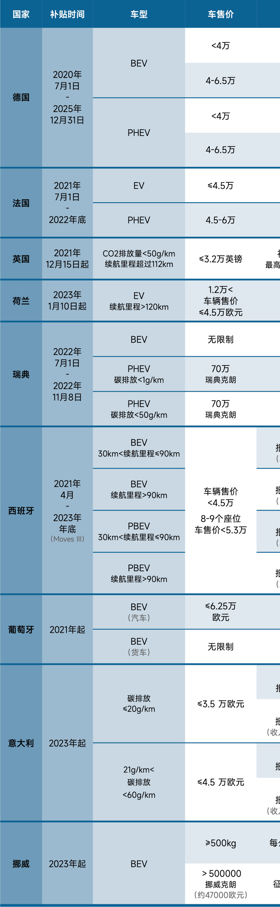 不过,降补基本已是大势所趋。美国对于新能源汽车补贴最高仍然维持7500美元,但增加金属矿物产地限制、电池材料产地限制。德国自2023年1月1日起,对售价4万欧元以下纯电动车的消费者补贴将从6000欧元降至4500欧元,并取消对插电式混合动力汽车的补贴。英国对纯电及插混车型补贴均取消。法国对售价47000欧元以下的、100%欧洲生产的纯电动新汽车补贴从6000欧降为5000欧元,并取消2000欧元的插混车型补贴。