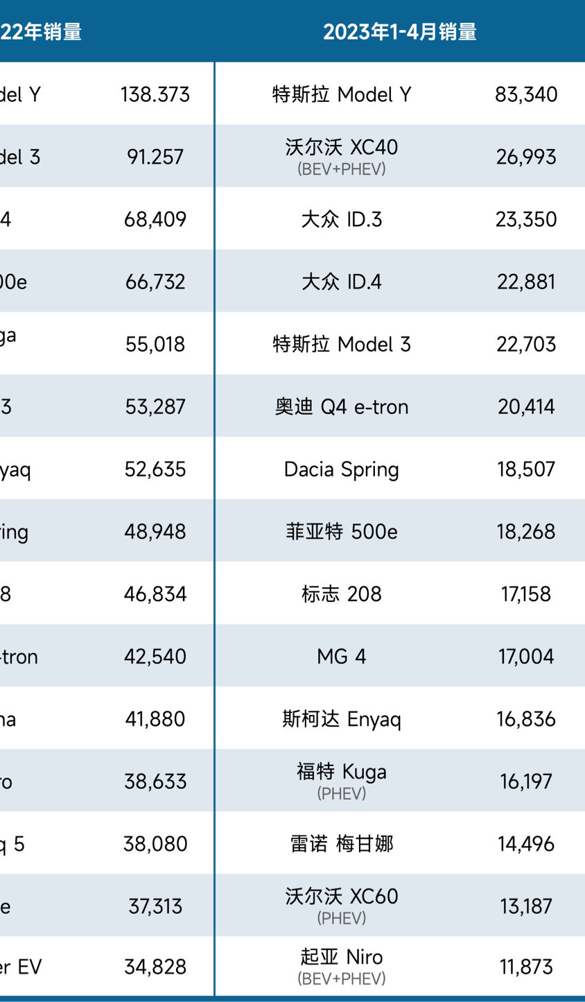 而在欧洲近两年多(2021年至2023年1-4月)电动汽车热销车型中,也几乎没有纯中资品牌身影。