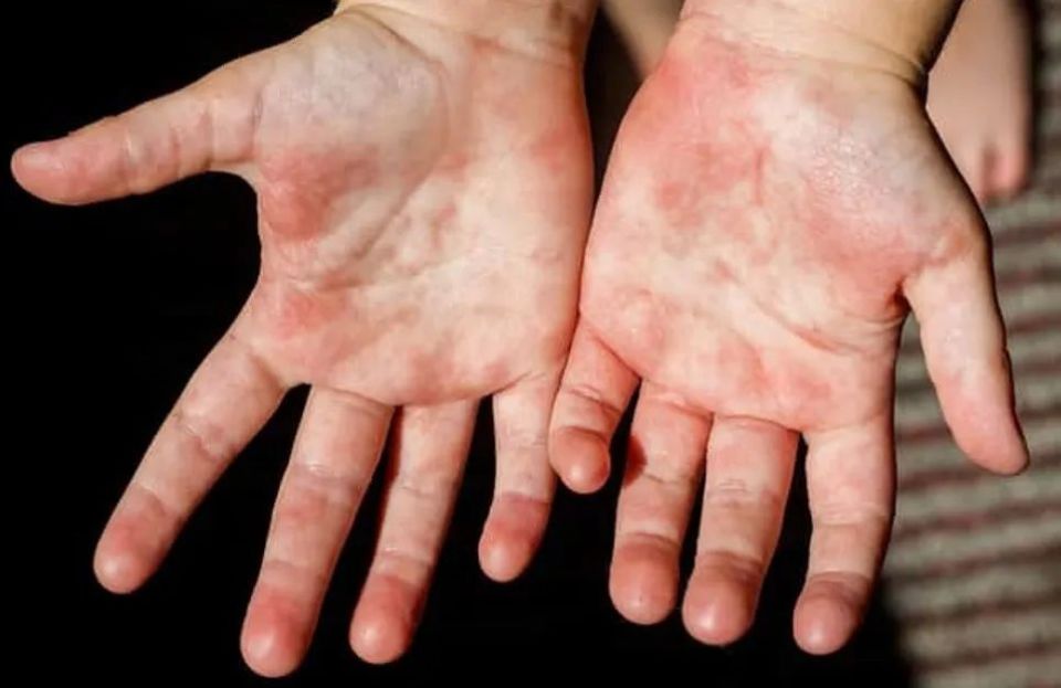 并发猩红热时,孩子身上会出现典型的猩红热样皮疹——弥漫性红色细小丘疹,始于腹股沟和腋窝,随后播散至躯干和四肢,后续可发生糠状脱屑。