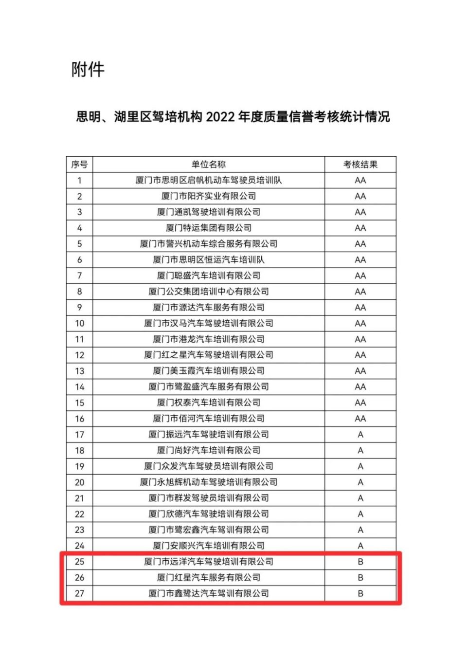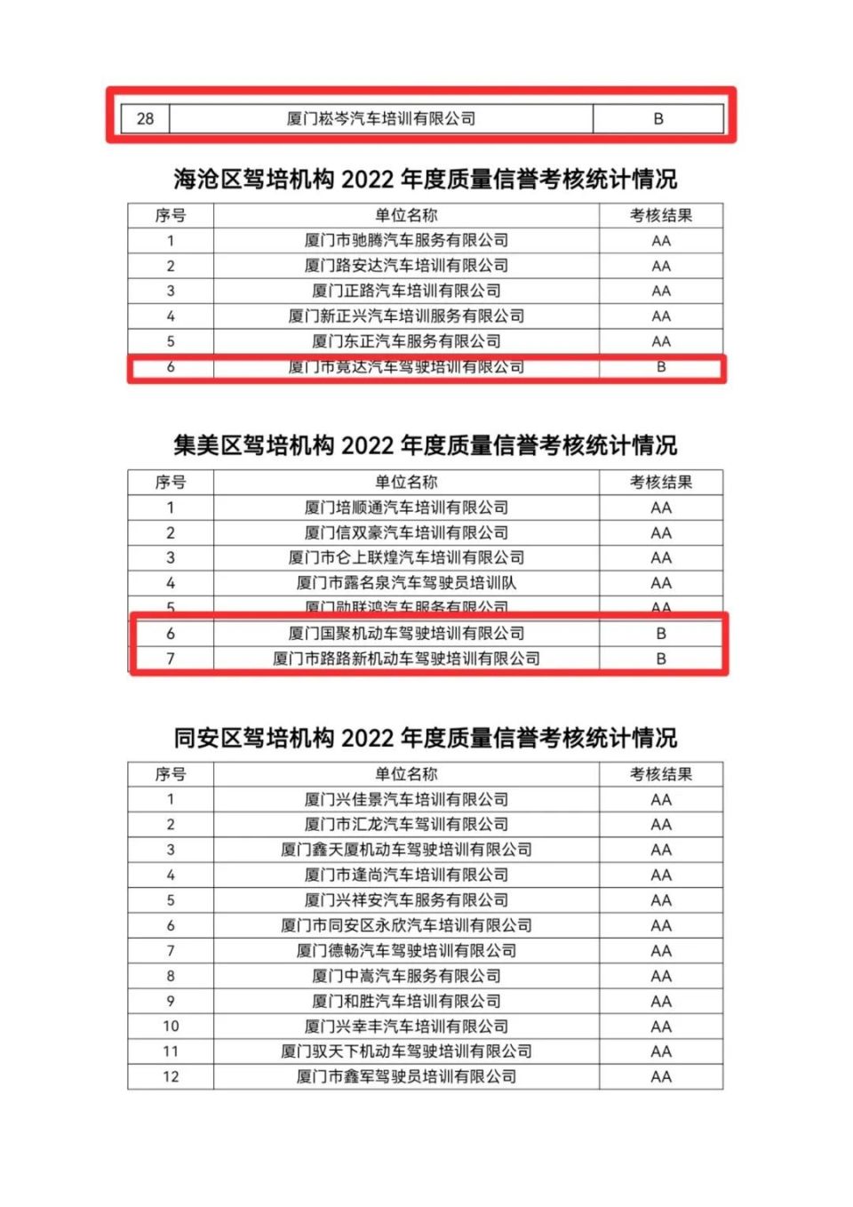 (标红为评级为B的驾培机构)