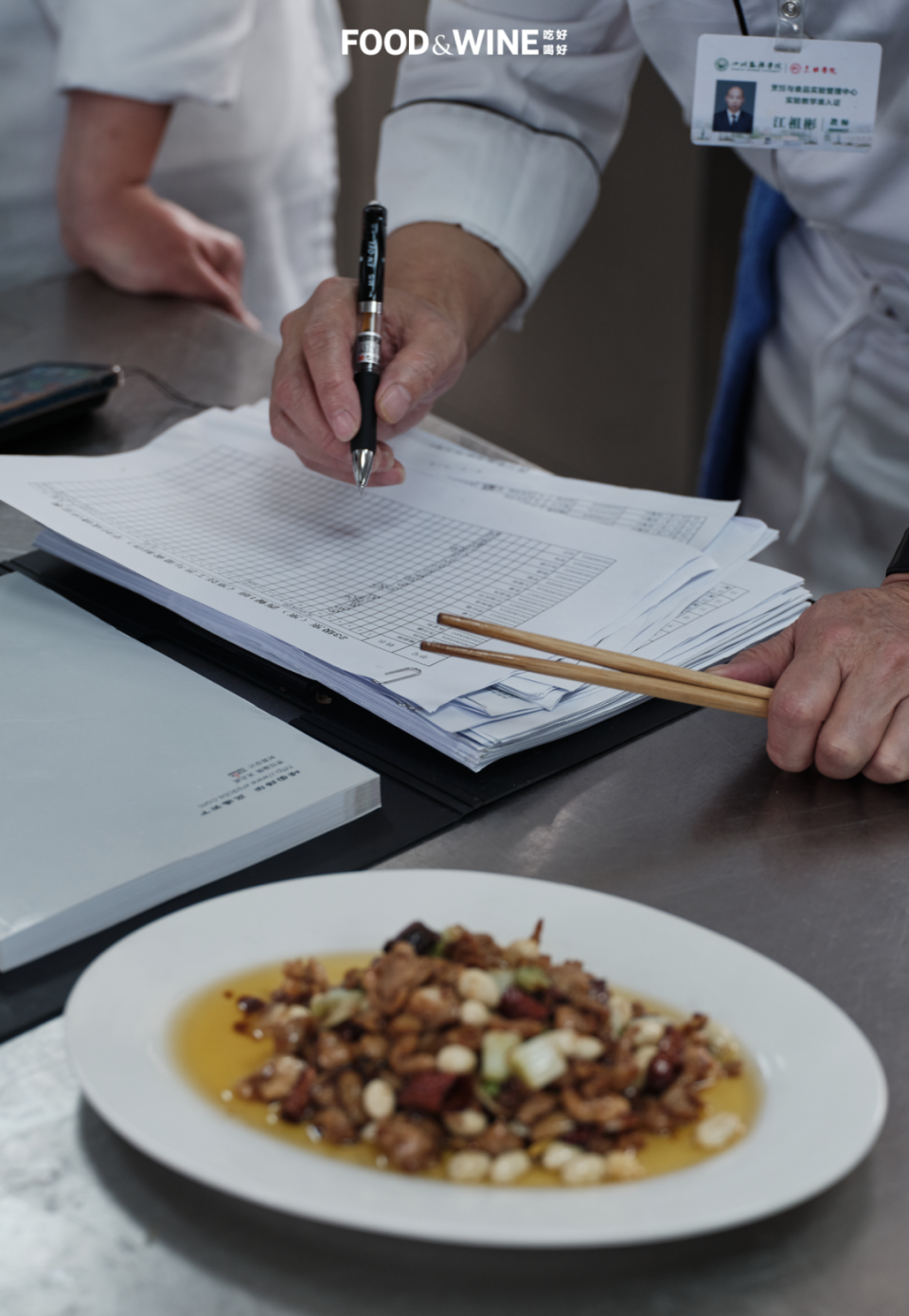 江祖彬对每一盘宫保鸡丁「望闻问切」,而后三言两语点出问题,可以具体到是哪个环节出了何种岔子,每个学生听完都露出类似醍醐灌顶的表情。随后,江老师俯身开始在花名册上找学生的名字,给这份宫保鸡丁判一个分数,记录在案。拿了成绩的同学再走回操作台前,从工作服臂袋里抽出筷子,自己尝尝,再尝尝旁人的那盘,仿佛要辨明为啥自己要比旁的同学少 3 分。我们自然没有放过建立赏鉴宫保鸡丁体系的难得机会,一盘一块地尝下来,从最低分 64 分到最高分 88 分的宫保鸡丁皆落肚,便越发觉江老师那第一盘的功力。