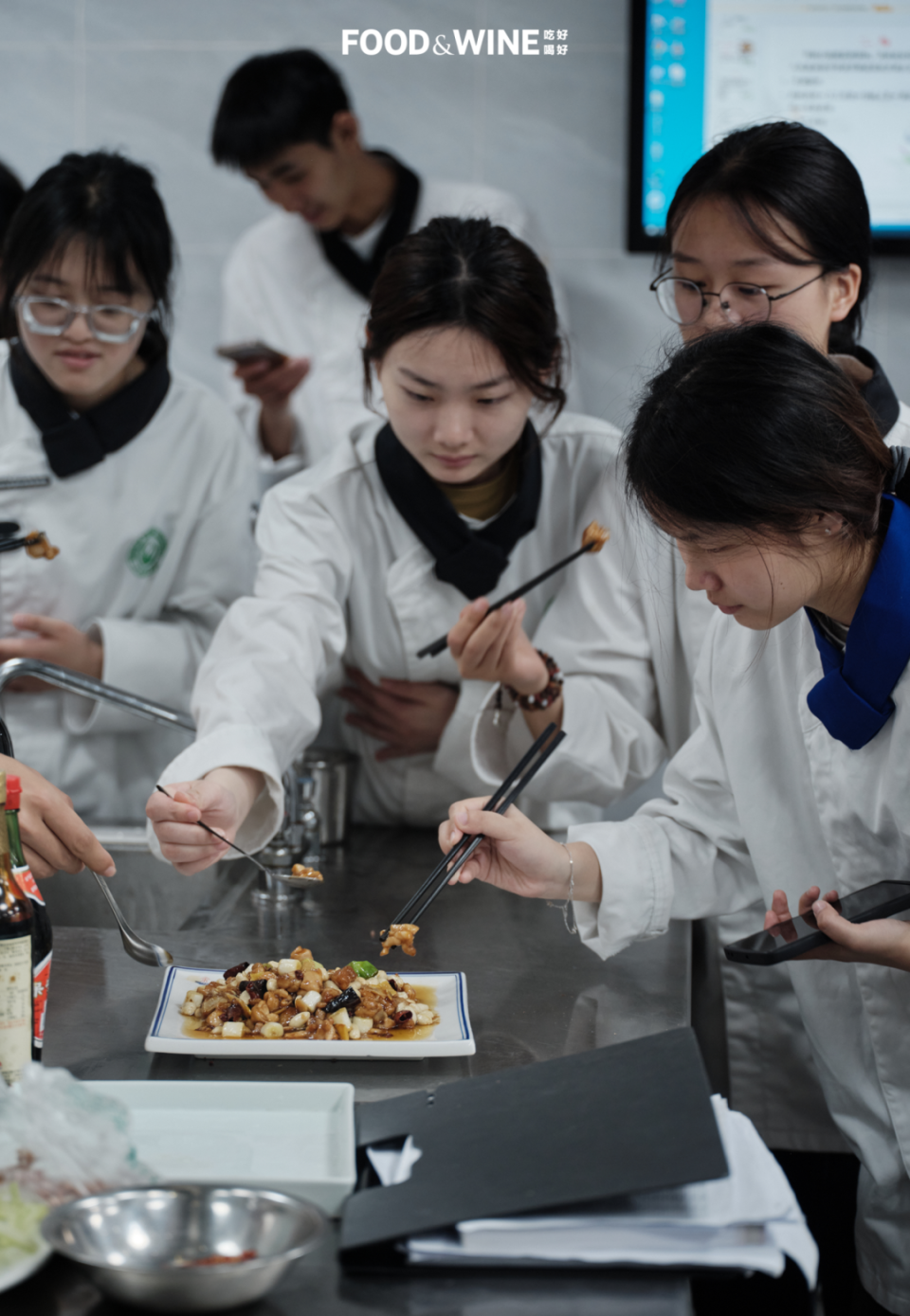 更活色生香的一幕接下来上演:学生得上手实践了,一个班要炒出 20 多盘宫保鸡丁和 20 多盆水煮肉片,江老师负责挨个品尝、点评并给出分数(百分制)。