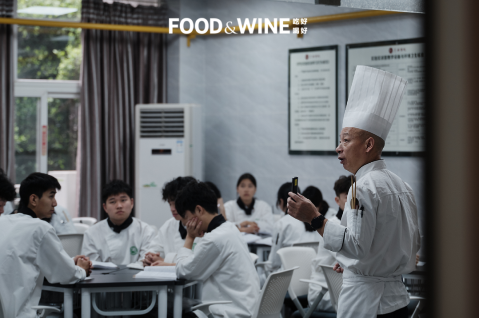 目光越过师生,能看到走廊对面墙上贴着一溜儿名厨介绍,这和教室里的热火朝天相得益彰。