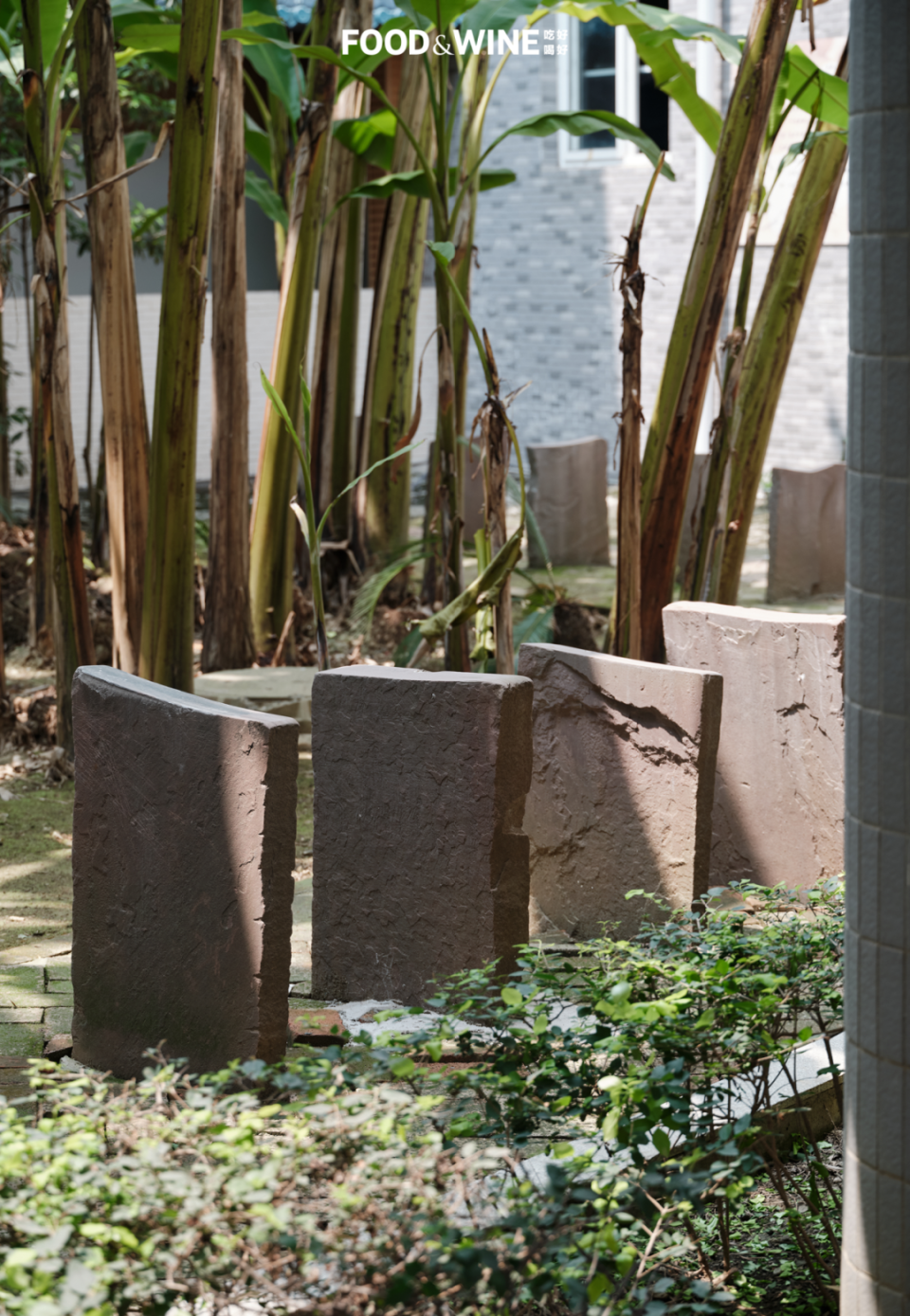 目光再望得远一点,开放式走廊外填满了茁壮的芭蕉叶,两层楼那么高。与众不同的是,在这一丛芭蕉树树根周围,立着一圈半人高的碑状石板,顶部平滑而微凹。不知内情的我们以为这是一处粗劣的园林造景,然而真相是这是学生们日日磨刀的磨刀石。每一天、每一年,都有学生在这里细细打磨那把有自己编号和名字的菜刀,30 年前的英国作家扶霞这么做过,30 年后,00 后的学弟学妹还在这么做。