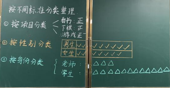 分类是重要的数学思想,本节课是学生第一次接触简单的统计活动,课堂上引导学生通过“童心园”的情境,按照项目、性别、身份进行分类整理。板书中呈现了学生用画“正”字、画“✓”、画图形三种方式表示分类的结果,让学生体会表示方法的多样性,也初步感受到用表格整理的好处。
