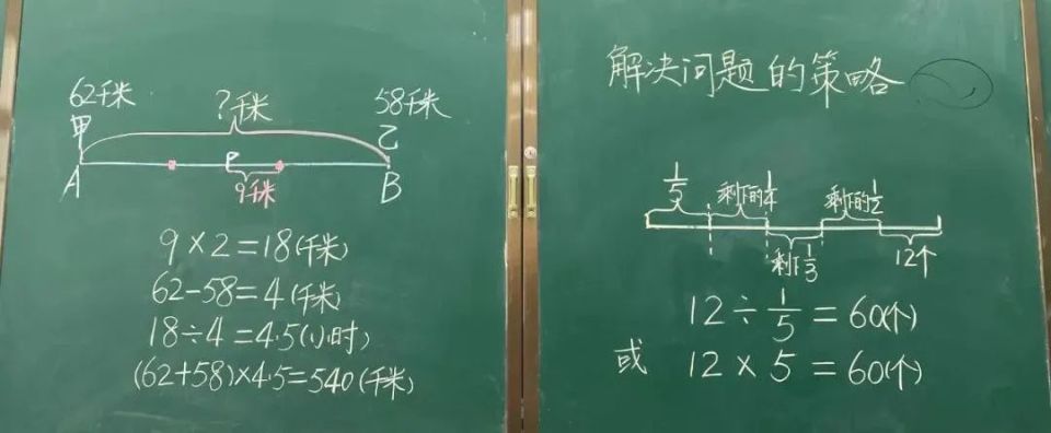 本节课板书,利用线段图简洁、明了地体现了数量之间的关系,化抽象为形象,利于学生理解。