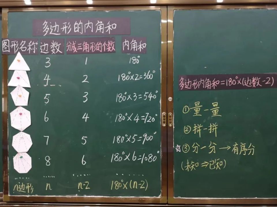 利用"分一分"探索多边形的内角和,化新知为旧知,将多边形的内角和转化为几个三角形的内角和。理解并掌握分一分的方法,在探索的过程中明白分成三角形的个数与多边形边数的关系,归纳出多边形内角和的计算公式。