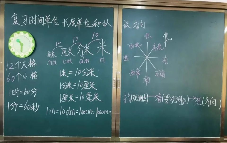 通过复习,进一步巩固时、分、秒的含义,以及它们之间的关系;复习长度单位,熟练运用长度单位测量并描述物体的长度,并会进行长度单位之间的单位换算;复习方向,使学生进一步认识八个方位及灵活运用方向确定位置,进而培养学生的空间观念。
