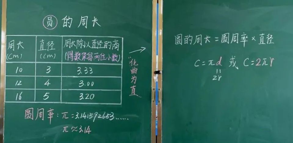 课题板书新颖,形象生动,能增加学生的学习兴趣。表格的呈现可以让学生更具体地感知圆的周长与直径的关系,从而更深刻地记得π的取值,为后面公式的推导作铺垫。第二块板书更是本节课的重难点及关键所在,清楚明了。