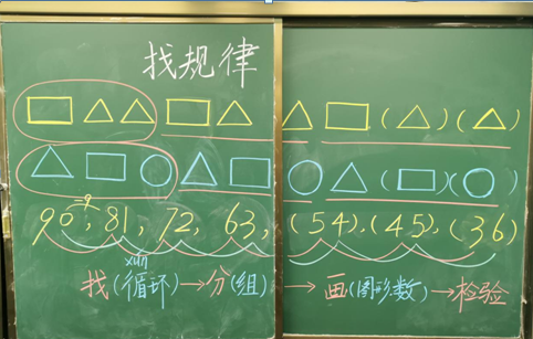 “找规律”是“数与代数”领域的内容,贯穿小学数学学习全学段。因为一年级孩子以形象思维为主,所以利用“圈、画”等方式将思考过程具象化,帮助不同层次学生理解与掌握“找规律”的方法。再辅助“步骤式”整理,引导学生“有序思考”。