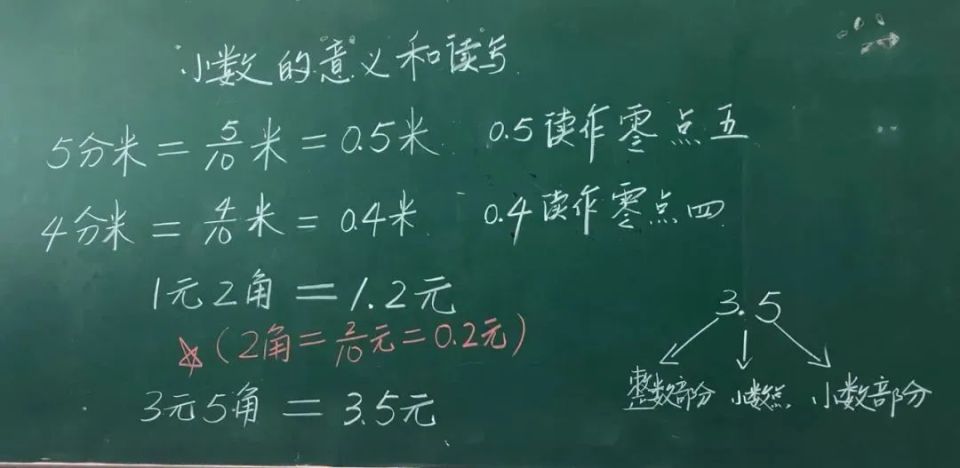 学生的小数知识起点是三年级时对一位小数的直观认识和刻画,这是教学的起点,也是思维的动点。本节课板书渗透了小数的意义,呈现了小数读写方法,并注意细节的处理,1元2角改写成用元作单位的小数,学生先改写2角,再进行整合,化难为简。