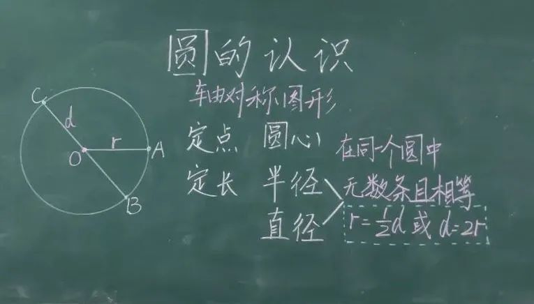 本节课是在学生已经直观认识圆的基础上,掌握圆规画圆方法,引导学生进一步认识圆的圆心、半径和直径,探索并发现圆的基本特征。因此,本课板书设计需简明扼要、条理分明、布局合理,把知识的重难点鲜明展示在学生眼前,加深学生的印象。