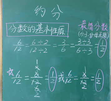 约分有两个关键点,一是约分的依据,即运用分数的基本性质进行约分,二是约分的结果必须是最简分数,而最简分数要求分子、分母互质。因此,在板书中分别用框和红色的粉笔来强调。而约分的过程实际就是运用分数的基本性质将分子、分母同时除以同一个非0数,将约分的过程与此联系起来,更清晰地感受到约分的简便。