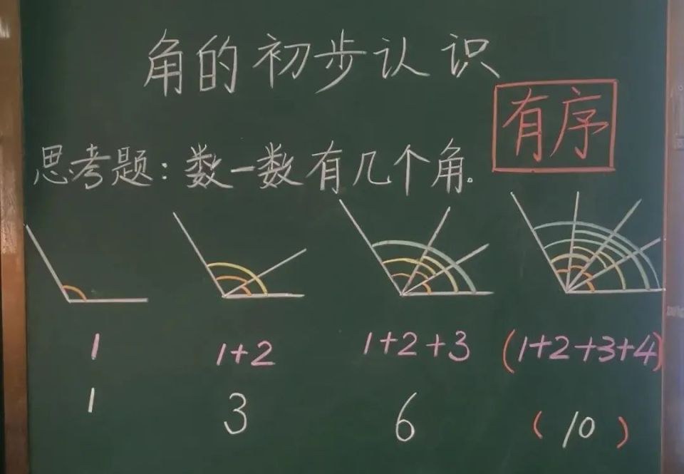 这是一节练习课,本板书的主要内容是思考题的分析过程。思考题要求学生在逐渐复杂的图形中按一定的顺序数出角的个数并体会其中的规律。分析题目的过程,可以使学生对角的概念有更深刻的认识,又可以帮助学生初步体会分类计数、有序思考的方法,感受常用的解决问题策略,发展数学思维能力。板书中用不同颜色的“弧线”数角,清晰明了,有助于学生体会有序思考的数学思想。