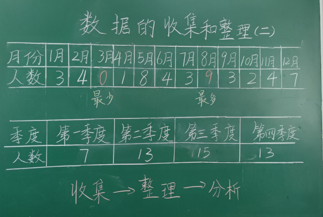 通过表格将各小组调查的结果汇总,引导学生对汇总后的数据进行分析,得出“第几个月出生人数最多和最少”等相关结论。在第二个表中,按不同标准把得到的数据重新分类,有助于让学生从不同角度更全面地理解蕴含的信息。