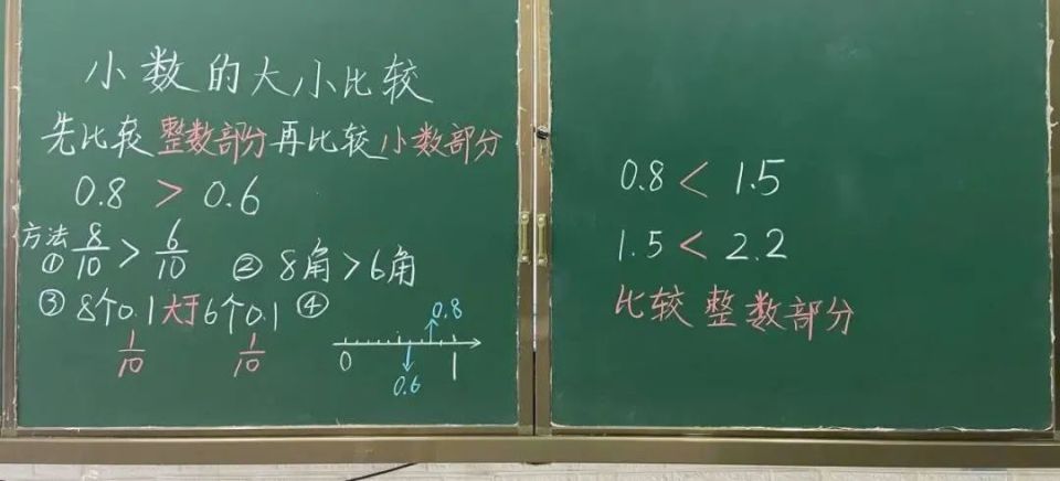 本节课分为两个层次进行教学,第一部分是0.8元和0.6元的比较,第二部分是0.8元与1.5元的比较。对于三年级的孩子而言,小数的大小比较需要借助于实际生活情境进行理解,与此同时,联系之前学习的知识(分数)也可以解决这个问题。数轴上的“找数”也是学生理解小数大小比较的方法之一。以上内容在板书中均有所体现。同时,对于小数比较的一般方法(先比较整数部分,再比较小数部分),板书上也有明确标注,既突出了本节课的重点,也梳理了本节课的内容。