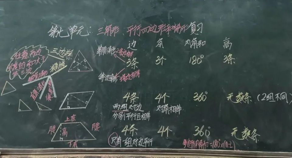 通过直观的板书进行复习归纳,层次分明、重点突出、布局合理、图文并茂,突显数学学科的特色,使学生理清本单元各个图形的知识点,有利于把握重点,起到深化巩固的作用。