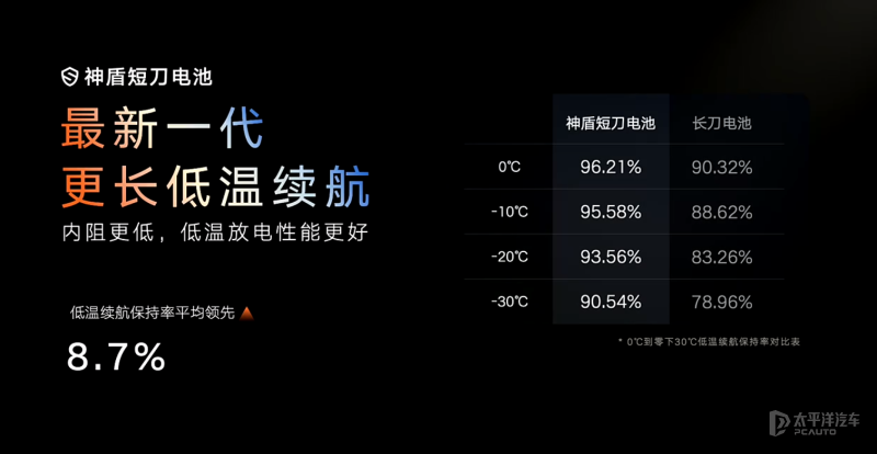 电池厚度对热量保持的影响:与长刀电池相比,神盾短刀电池的厚度为18.2mm,这种设计有助于在低温放电时减缓热量的散失。较厚的电池结构提供了更好的热稳定性,有助于维持电池内部温度,从而在极寒条件下也能保持电池性能。