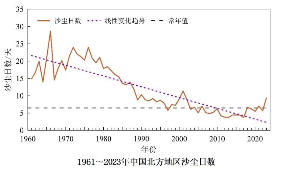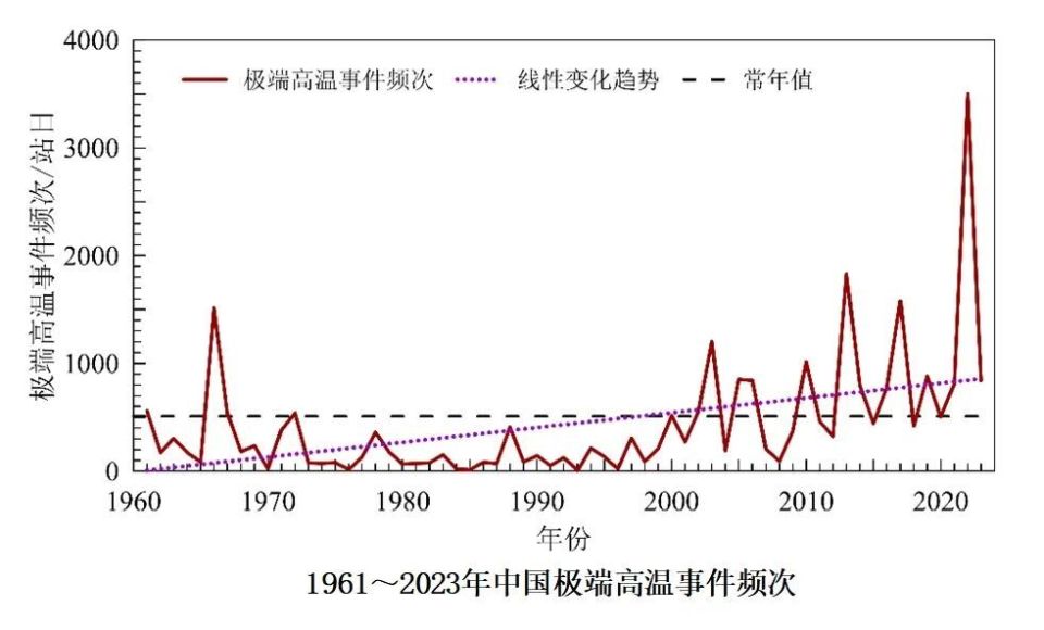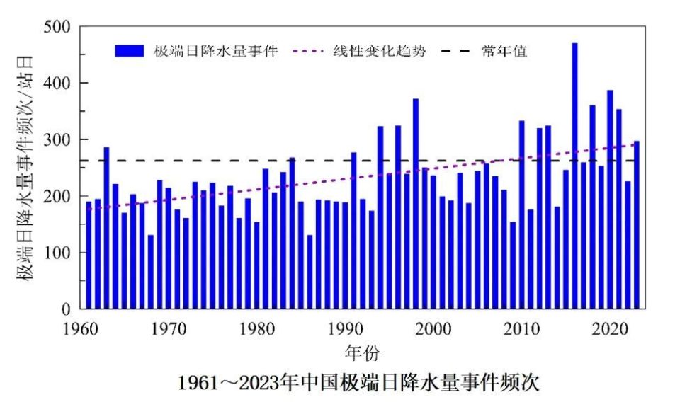 极端天气气候事件趋多趋重。1961至2023年,中国平均年降水量呈增加趋势,平均每10年增加5.2毫米。中国极端高温和极端强降水事件趋多趋强,极端低温事件总体减少;北方地区平均沙尘日数呈显著减少趋势,近年来达最低值并略有回升;20世纪90年代后期以来登陆中国台风的平均强度波动增强。全球海洋变暖显著加速,海表温度和海洋热含量再创新高,全球平均海平面持续上升。1958至2023年,全球海洋(上层2000米)热含量呈显著增加趋势,且海洋变暖在20世纪90年代以来显著加速;2023年,全球海洋热含量再创新高。全球平均海平面呈持续上升趋势,2023年达到有卫星观测记录以来的最高位。1958至2023年全球海洋热含量(上层2000米)距平变化