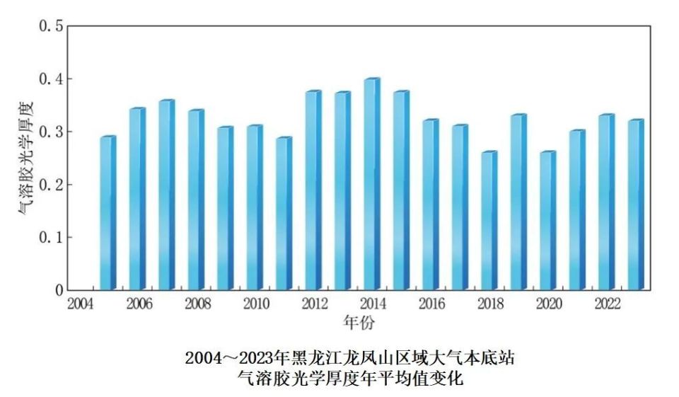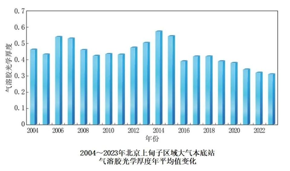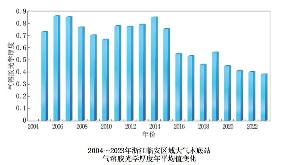 中国气溶胶光学厚度总体呈下降趋势。2004至2014年,北京上甸子、浙江临安和黑龙江龙凤山区域大气本底站气溶胶光学厚度年平均值波动增加;之后,均呈波动降低趋势。2023年,上甸子、临安和龙凤山站气溶胶光学厚度较2022年均略有降低,其中上甸子和临安站均为有观测记录以来的最低值。