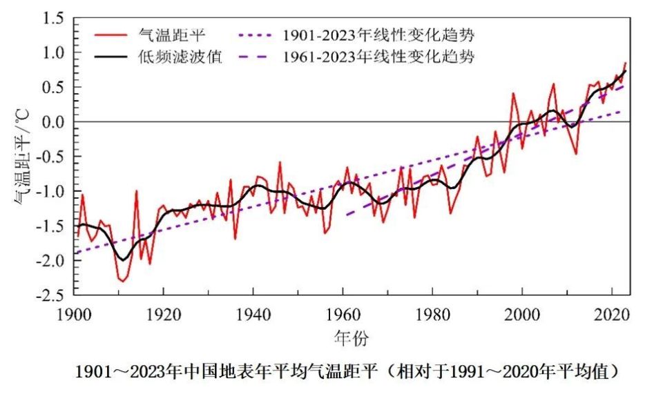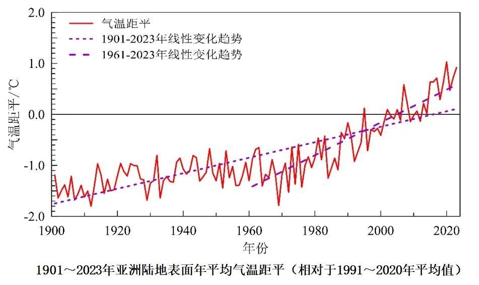 2023年,亚洲区域平均气温较常年值(报告使用1991至2020年气候基准期)偏高0.92℃,是1901年以来第二高值;中国地表年平均气温较常年值偏高0.84℃,为1901年以来的最暖年份。