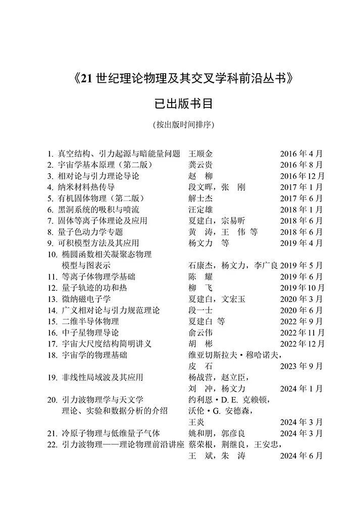 为了让更多对引力波物理感兴趣的物理学工作者及广大学生了解、学习引力波相关基础知识,在科学出版社支持下,我们邀请了暑期讲习班授课教授把他们的讲课笔记整理出来,编辑成书——《引力波物理——理论物理前沿讲座》(蔡荣根等主编. 北京:科学出版社,2024.6)。本书内容包括: