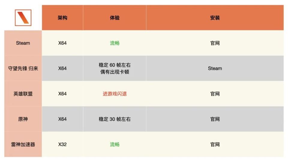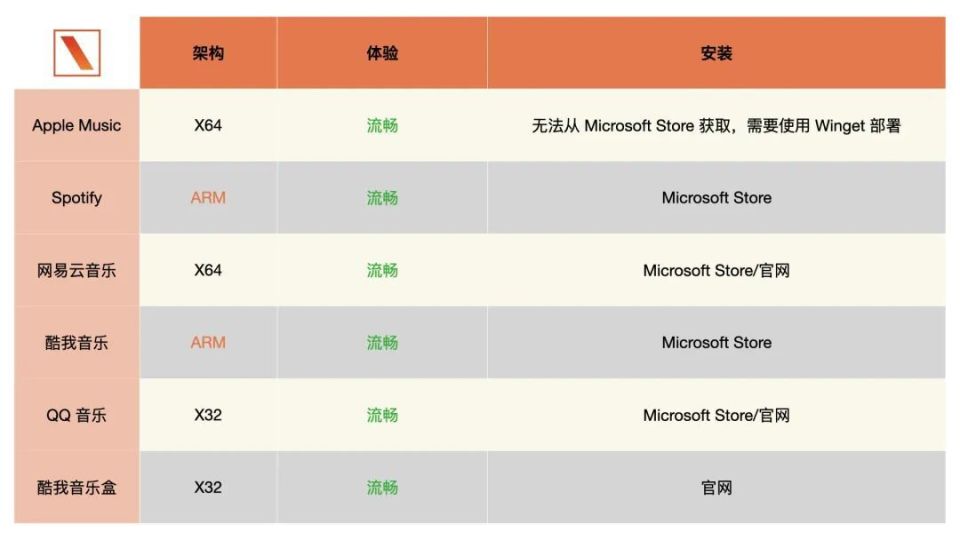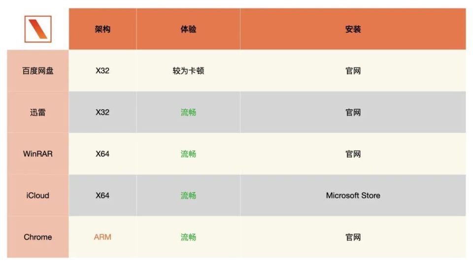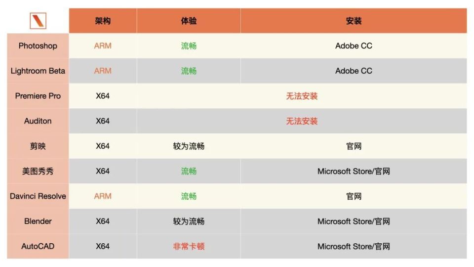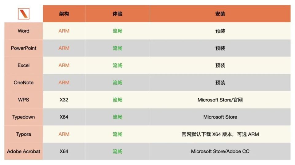 搭载高通骁龙 X 系列芯片的设备,已经陆陆续续推出一个多月了。除了这块骁龙芯的性能,大家更关心的是,微软和高通再次发力的 Windows on ARM 平台,究竟能否如微软所承诺那般,能够运行「大多数 Windows 应用程序」,并且还能保证流畅度。因此,爱范儿以搭载了骁龙 X Elite 芯片的第 11 代 Surface Pro 为测试设备(芯片型号:X1E-80-100;16GB 内存),准备了将近 40 个应用,看看这个面向未来的新设备和新系统,能不能经受住当下大部分场景的考验。如果没有特别指出,文章内提到的「ARM 架构」应用都是指 ARM64 位,而单独的「64 位」和「32 位」都是指 x86 下的架构;除了游戏,电源都是「平衡」模式。测试过的所有应用结果如下:左右滑动来查看更多图片完全胜任科技编辑的工作作为一名科技编辑,我在测试过程中将这台设备当作了我的主力机,替换了工作用的 M1 MacBook Air(8GB 内存),用它完成了部分早报和文章的写作,下面说说我的应用使用体验。我的日常办公场景大概如下: 在微信、企业微信、QQ(Tim)上进行协作交流 使用 MarkDown 编辑器进行文章写作 Chrome 上打开多个标签页和插件进行选题和资料收集,以及在线编辑 使用 Notion 来收集素材和整理思路 用飞书将文章编辑好给同事审稿 Apple Music 作为 BGM 时不时需要使用美图秀秀编辑图片尺寸 会用到 Office 三件套或者 WPS 编辑资料先给出一个结论:在这些场景下,Windows on ARM 都能很好应付,体验不输 MacBook Air。比如,Chrome 和 Microsoft Office 套件,由于都是基于 ARM 架构开发,体验顺滑。以吃内存和性能著称的 Chrome,在我打开将近二十个标签页的情况下,反应也丝毫不被拖慢,更不用说微软自己开发的 Office,用 Excel 处理超大数据表也是「指哪打哪」。至于没有原生开发的应用,使用体验也让人满意。像是微信、企业微信、美图秀秀、Apple Music 、WinRAR、迅雷、WPS、Tim,这几款应用都是非原生开发,体验都和其他平台上一样基本流畅不卡,其中迅雷更是连弹窗广告都完美显示。至于 Markdown 编辑器,由于我平时使用的平台不提供 Windows 版本,所以尝试下载使用了 Typora 和 Typedown 两个编辑器,前者从官网下载,后者从 Microsoft Store 应用商店下载。比较神奇的是,在我安装 Typora 的安装包后,打开应用发现:但 Typora 是官方提供 ARM 版本的,不知道为什么官网会默认下载一个打不开的 x64 版本。两个编辑器使用体验无可挑剔,即使是非原生开发的 Typedown,也不会和原生的 Typora 有太大差距。而像飞书、Notion 两个类似的笔记和在线文档应用,大部分场景都没问题,在切换页面和滑动长篇的文档时,还是会出现延迟和卡顿。而在工作中遇到不那么顺手的应用是百度网盘。百度网盘无法直接从 Microsoft Store 中获取,在官网默认下载的是 32 位版本,安装和打开都没有问题,基本的文件下载、上传操作都可以顺利完成,而如果页面内显示的内容较多,滑动就会出现明显的掉帧。大部分应用的安装都是通过 Microsoft Store 应用商店或者官网下载安装包的方式,但有时候也会出现像上文提到的 Typora 和百度网盘那样的问题。比如说 QQ,明明有原生 ARM 版本,应用商店却只提供 x64 版本,虽然使用体验没有太大差距。只在 Microsoft Store 提供的 Apple Music,则显示「此产品与电脑的处理器不兼容」。上网搜索了一下,发现可以通过 Winget 的方式本地部署这个应用。终于装好后,我发现这个「处理器不兼容」的 Apple Music,在转译后甚至比 macOS Sonoma 上的音乐应用体验感更好......而苹果在 Microsoft 应用商店提供的另一个应用「iCloud」明明同样是 x64 架构,却可以直接从商店下载和安装,让人有点摸不着头脑。至于表现,这个 iCloud 也和 Apple Music 一样让人满意。总结一下,在「科技编辑」的工作环境中,这款骁龙芯 Surface 完全足够成为一台主力机型。我需要使用的所有应用都能够运行,就连体验最差的百度网盘,我都愿意给一个 70 分,因为除了一些场景,基本不会卡顿。当然,我也知道科技编辑的工作对设备的要求其实并不高,甚至很多时候,一个浏览器一个编辑器就能完成大部分工作。所以,接下来的部分我对另外一些常用的应用进行了测试。强度高点的专业应用还需努力在微软 Build 2024 大会上,Adobe 承诺会将全家桶带到 Windows on ARM 平台上,2 个月过去,现在的情况如何?打开 Adobe Creative Cloud,发现这个在别的设备上提供很多应用的平台,在这台 Surface 上空空荡荡的。(其实还有一个还在测试中的 Lightroom Beta)作为 Build 2024 上的演示应用,基于 ARM 开发的 Photoshop 体验自然非常舒适,连有点吃性能的滤镜「动态模糊」效果实时预览都能秒实现,和 2020 年 Surface Pro X 跑 x86 的版本拖动图片都会异常卡顿的体验天差地别。