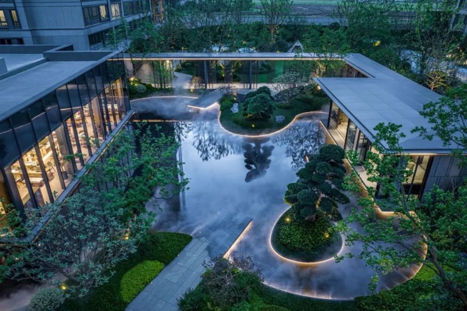 高层天幕立面窗墙比高达0.245,全屋采用中空Low-E玻璃,呈现“轻、平、薄”的设计美学。中式合院传承苏派中式风格,以粉墙黛瓦、巷道、庭院、漏窗、月洞门、门廊,映照江南风华。