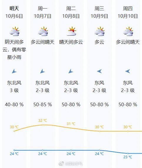据@深圳天气 预计,10月8日—10月27日干燥少雨,天气转凉。期间有两次弱冷空气影响,分别在10月上旬末和中旬末;10月中、下旬海上热带云团较活跃,有台风生成并趋向广东沿海,较大可能影响时段为中旬末前后。