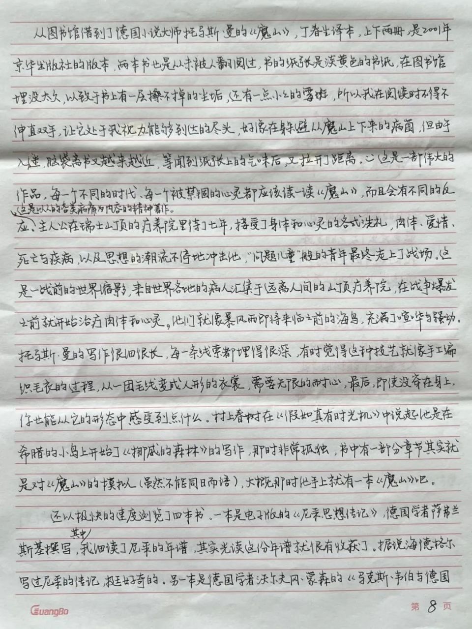 从图书馆借到了德国小说大师托马斯·曼的《魔山》,丁春生译本,上下两册,是2001年京华出版社的版本。两本书也是从未被人翻阅过,书的纸张是淡黄色的书纸,在图书馆埋没太久,以致于书上有一层擦不掉的尘垢,还有一点小小的霉斑,所以我在阅读时不得不伸直双手,让它处于我视力能够到达的尽头,好像在躲避从魔山上下来的病菌。但由于入迷,脑袋离书又越来越近,等闻到纸张上的气味后,又拉开了距离。·-·