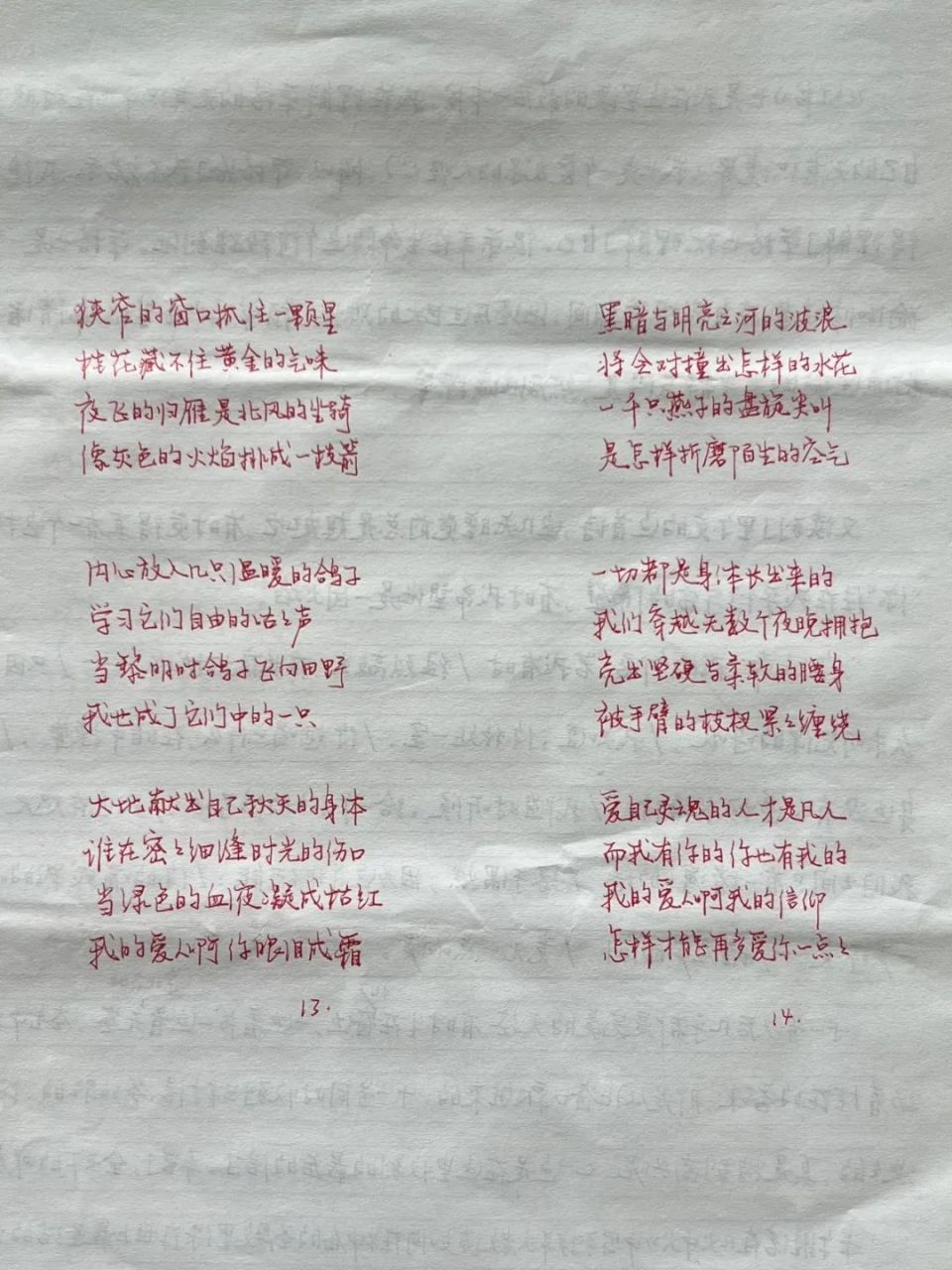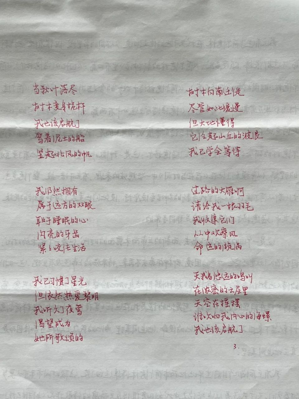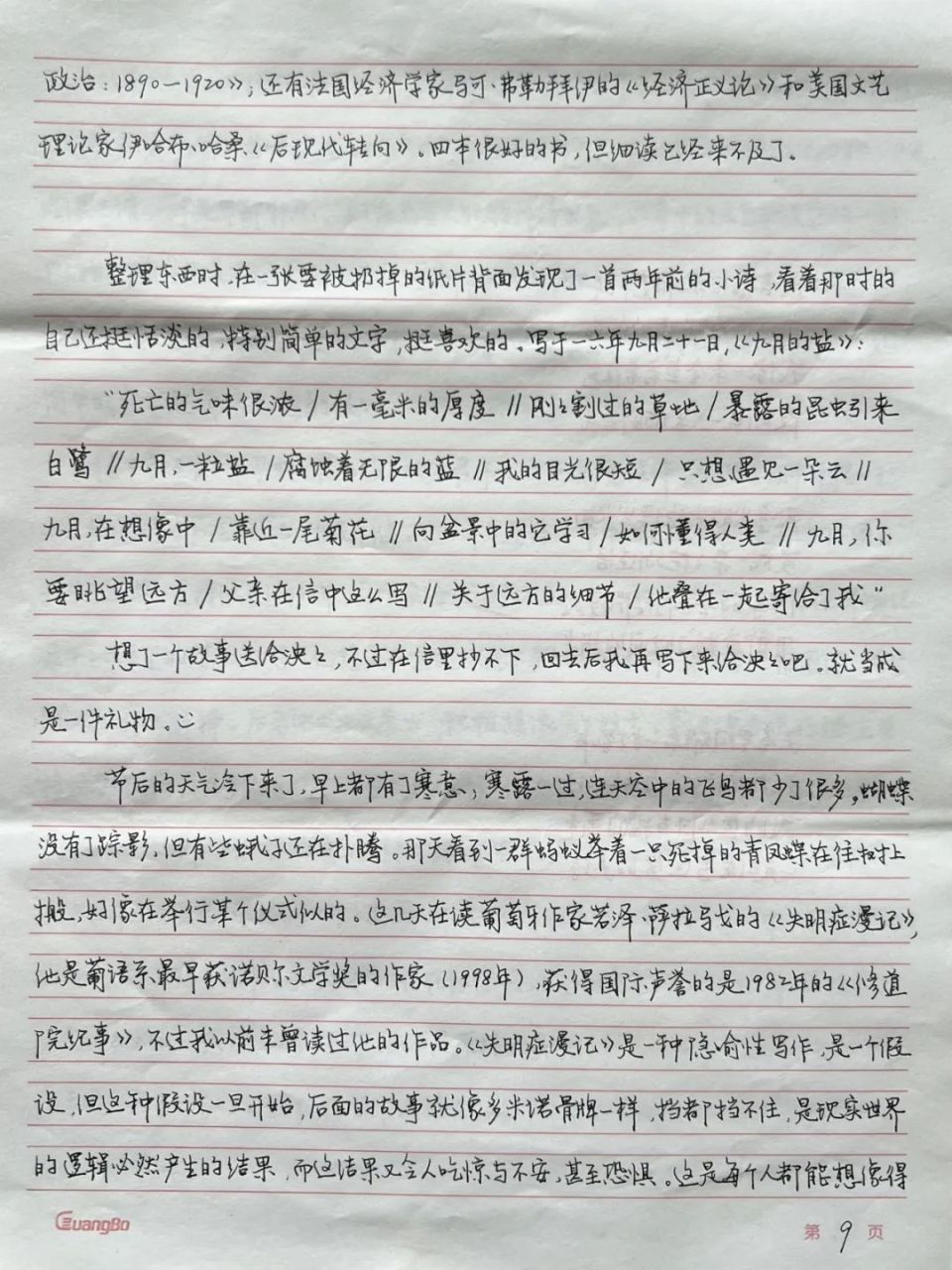 除了一些文件、剩下的书外,还有就是读书笔记和一百三十多页我写给花花的诗歌原稿了。尽管诗已经抄在信里寄给你们了,但我还是把原稿细心保存着,准备回去后作为礼物送给花花。以后我会时不时抽出几页,读给花花听。·-·有时看文字和听读的感受会非常不同呢。