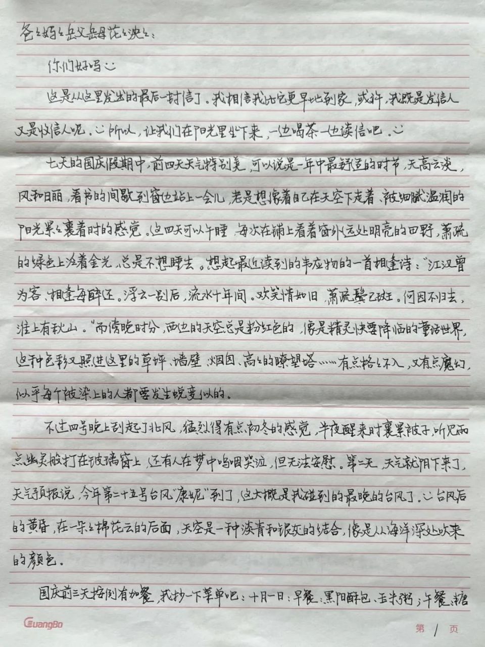 十一号以后几乎都是完美的天空,有时坐在北窗边,一边看书一边看东北的天空。空气中又流动着桂花的香味,那是从南窗口飘进来的。十一号同时收到三封信,爸爸妈妈的、花花的、泱泱的,真是特别高兴呢。·-·