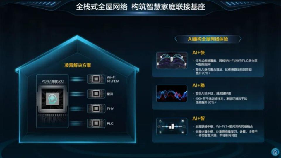 此外,凌霄760还首次将AI技术引入了Wi-Fi 7家庭网络套片中。通过内置独立的AI核心,凌霄760显著提升了神经网络运算效率,具备了强大的端侧AI能力。这一创新之举,使得凌霄760在AI超级组网、AI抗干扰以及AI全屋智能中枢等方面展现出了卓越的性能,为用户带来了更加智能、便捷的家庭网络使用体验。