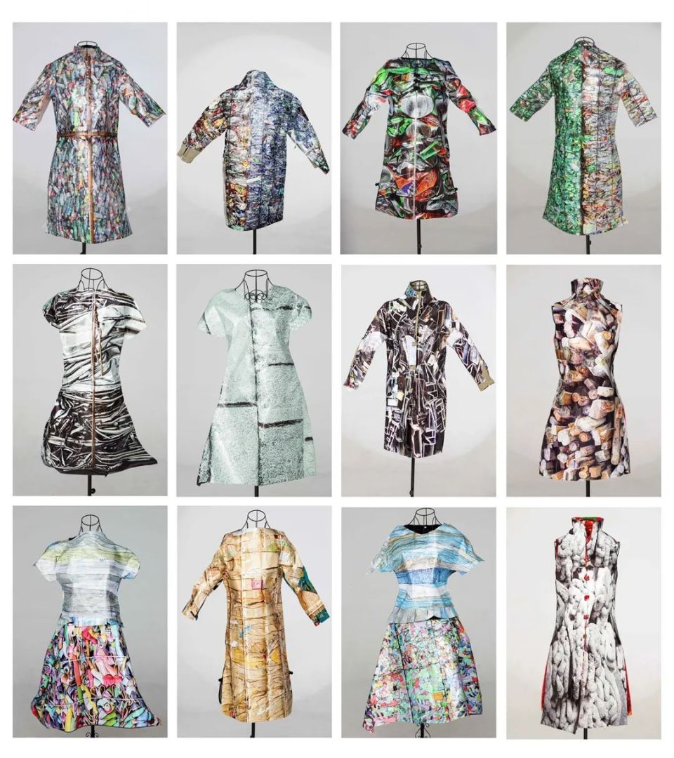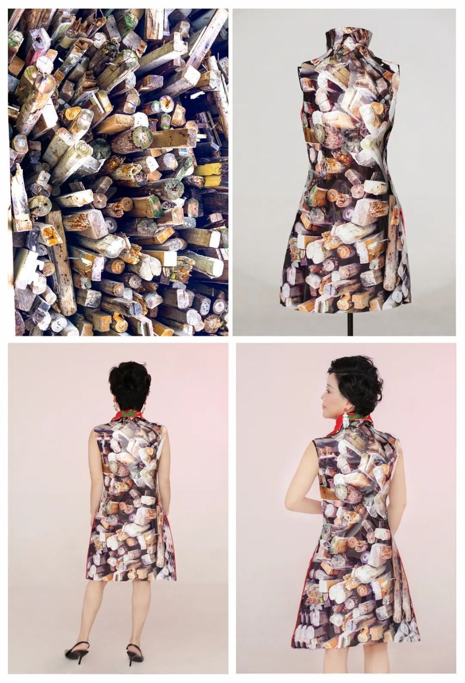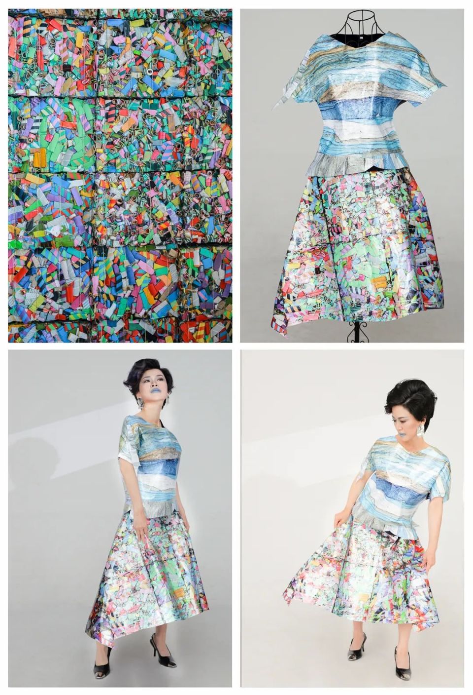 废品变时装后摄影师为废品发声:被回收的纺织用的纸筒被压缩捆绑后依然色彩斑琅非常漂亮。
