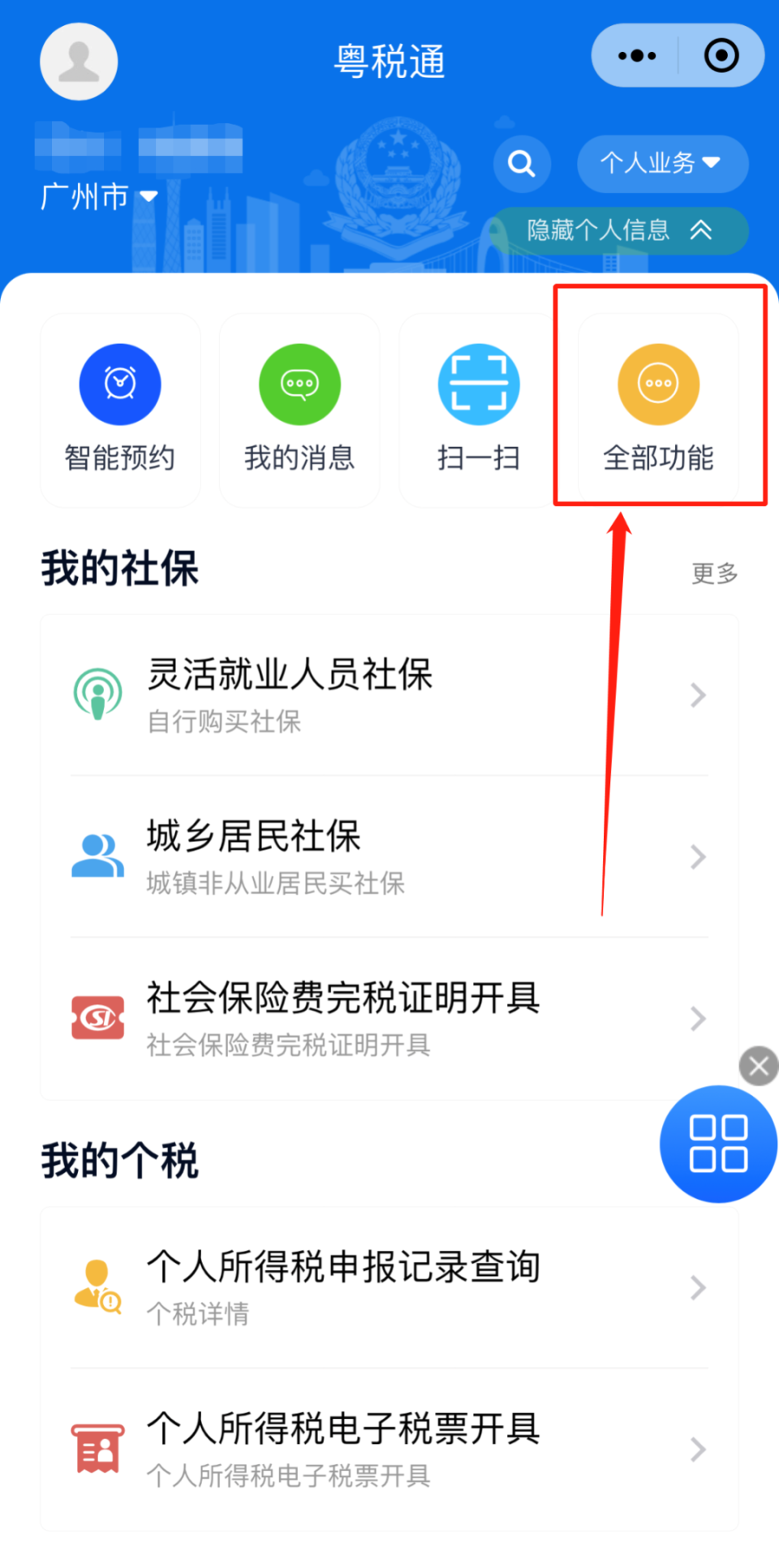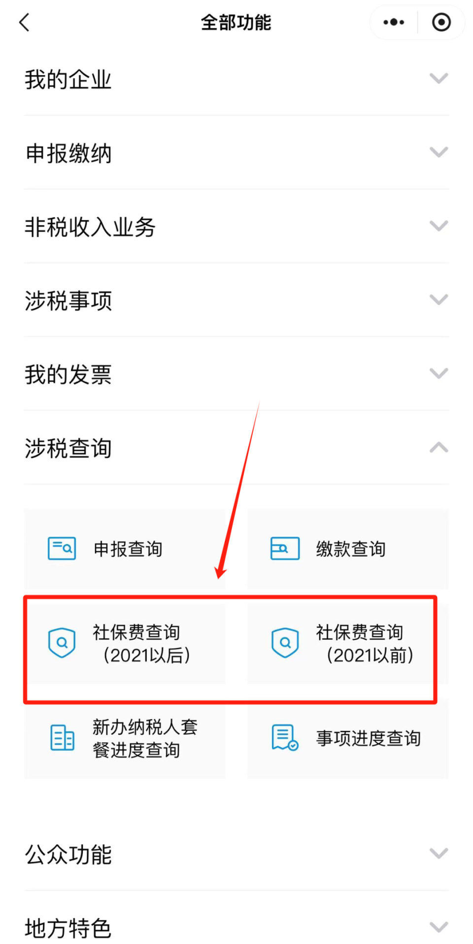 进入口首页点击【全部功能】-【涉税查询】-【社保费查询】