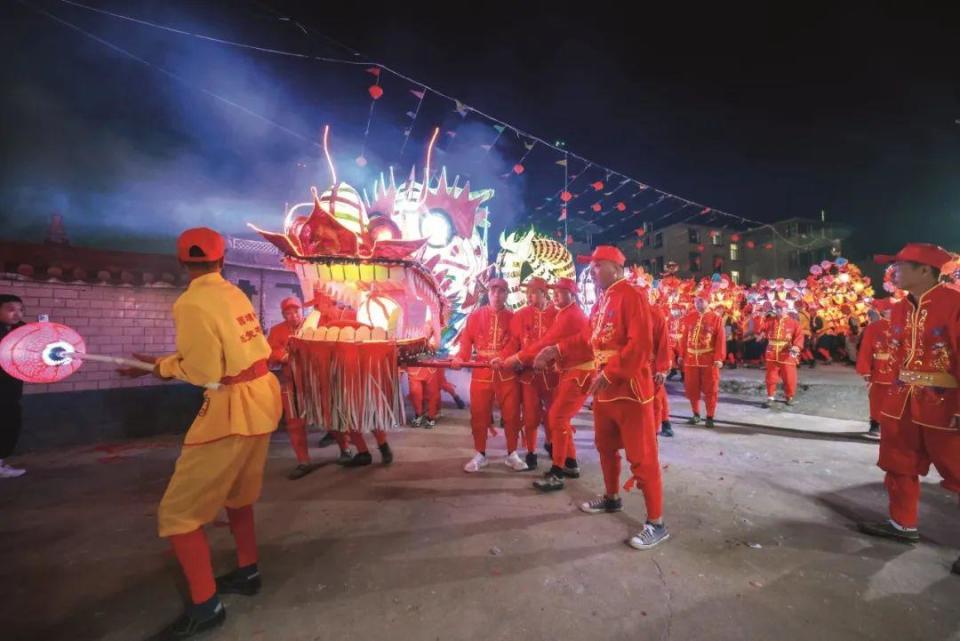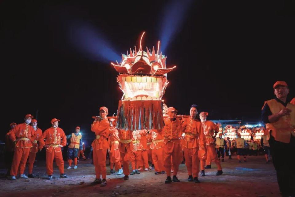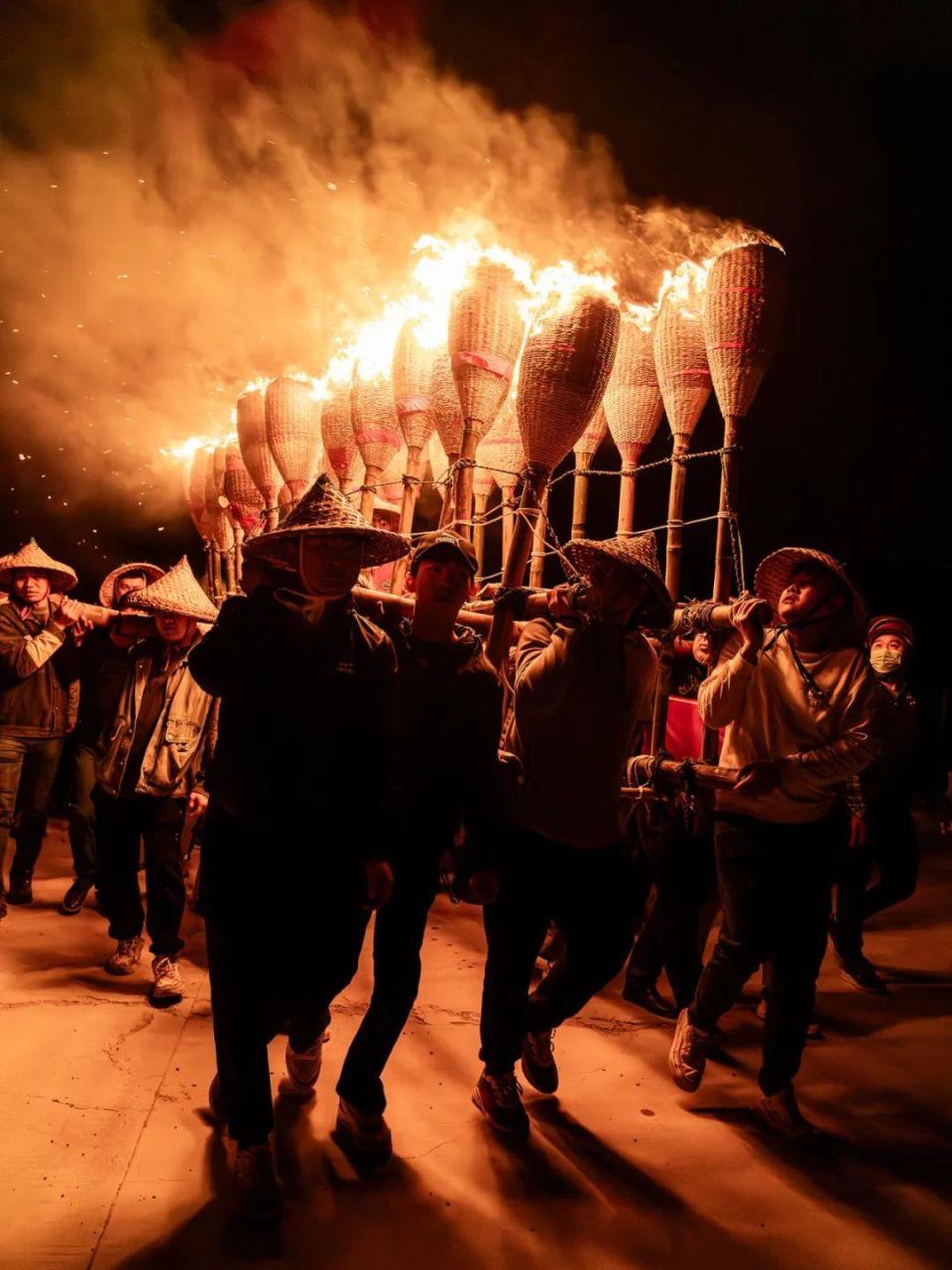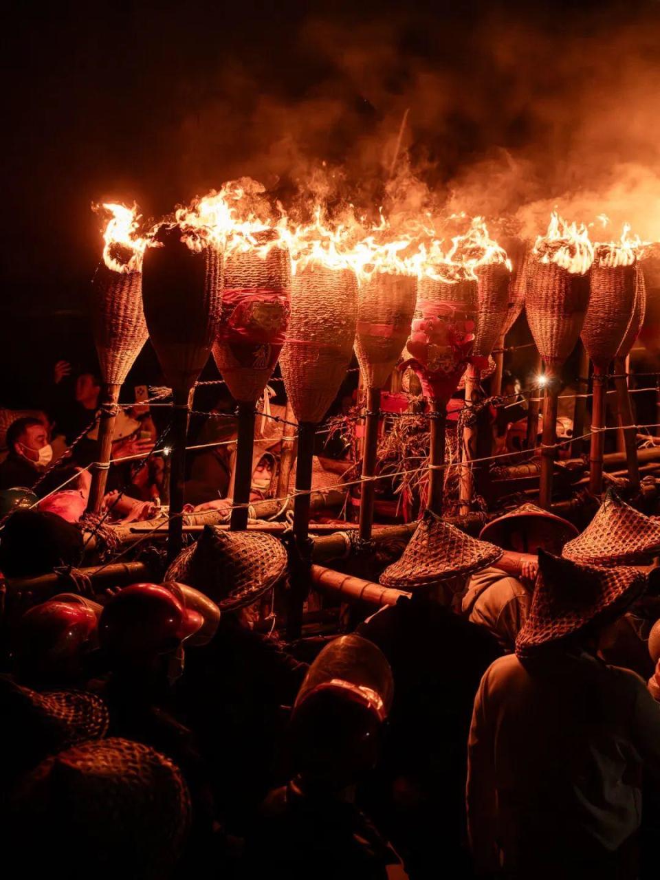 后江村位于陈岱镇最东边临海处,村内庙宇供奉的开漳圣王神,既是村里的祖先神,也是民俗神。每年元宵节,村民们都会宰猪杀羊举行祭祀仪式,邀请开漳圣王及诸位神明出社巡游。其间,村民还会举着自制的巨大火把绕村而行,寄托了沿海渔村对新年红红火火、平平安安的美好期冀。可以说,后江火把节是将祠堂家祭与庙会祭祀结合,构成带有海洋特质的民俗文化风情。