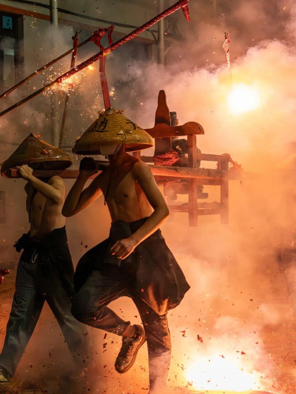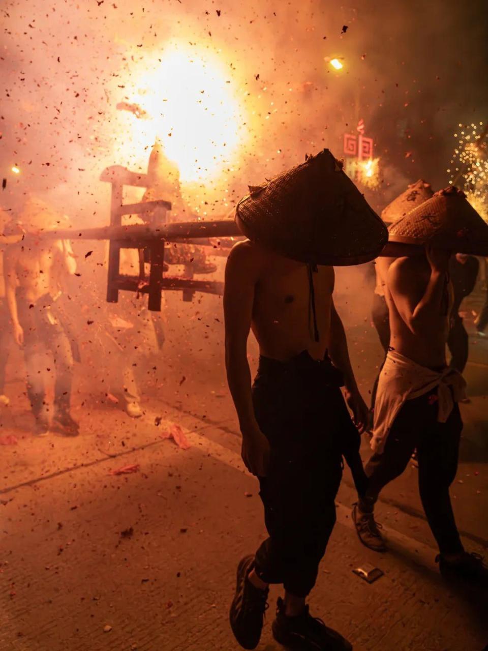 而对游客而言,炸佛的另一大看点就是抬佛的青年男子们。这些男孩必须从本地人中挑选,一般都是青壮年,他们头戴斗笠,赤裸着上身。除了抬佛像的几个,还有一些人紧跟在佛像后面作为轮替。抬佛像的人事先都要诚心沐浴净身,据说这样抬的过程中才不会被鞭炮弹着身子,烧伤疼痛,而且今后会好运气。