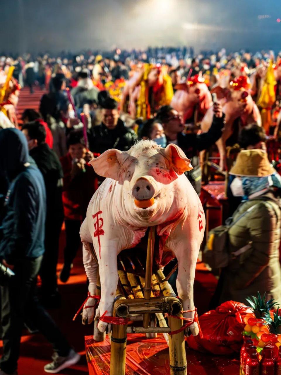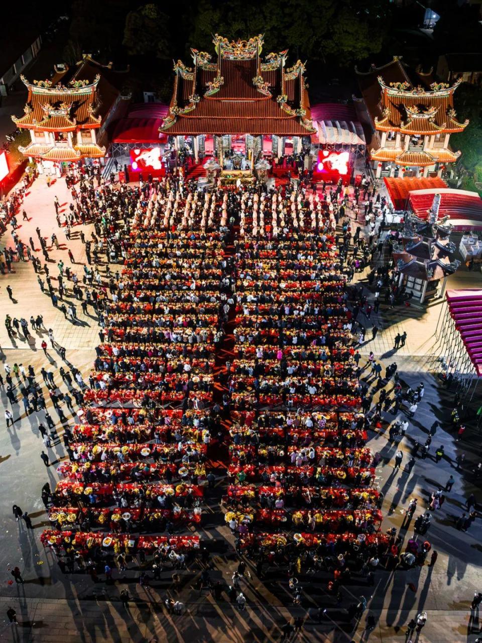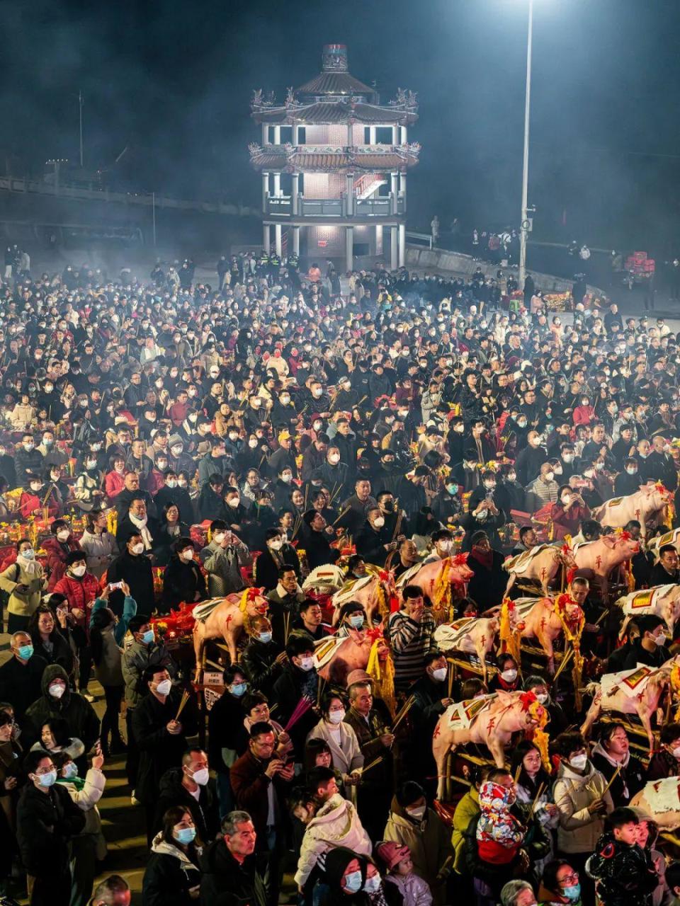 玉尊宫坐落于风光秀美的九龙江畔,占地面积约100亩,庙堂供祀玉皇至尊。每到农历正月初八,玉尊宫前的广场上就会摆上红色供桌方阵(最多时会有近600张供桌),五果、六斋、五牲、红龟粿等各种贡品整齐摆放,烟花香烛交相辉映。最震撼的前排主供桌上的近百头宰杀洗净的全猪和全羊祭品,它们头仰朝天,口含红橘,身上写着“合家平安”,脖上还挂着红包袋,寓意吉祥如意。