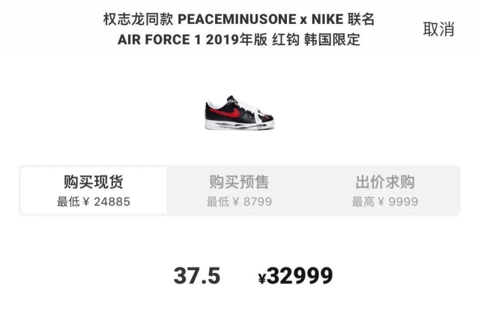 例如那双于2019年发布的PEACEMINUSONE和Nike Air Force 1 的联名款鞋(他从部队退役那年),曾一度被炒到近人民币4万的超高价格,而且当时哪怕你再有钱也不一定抢得到,因为走到哪里都断货……