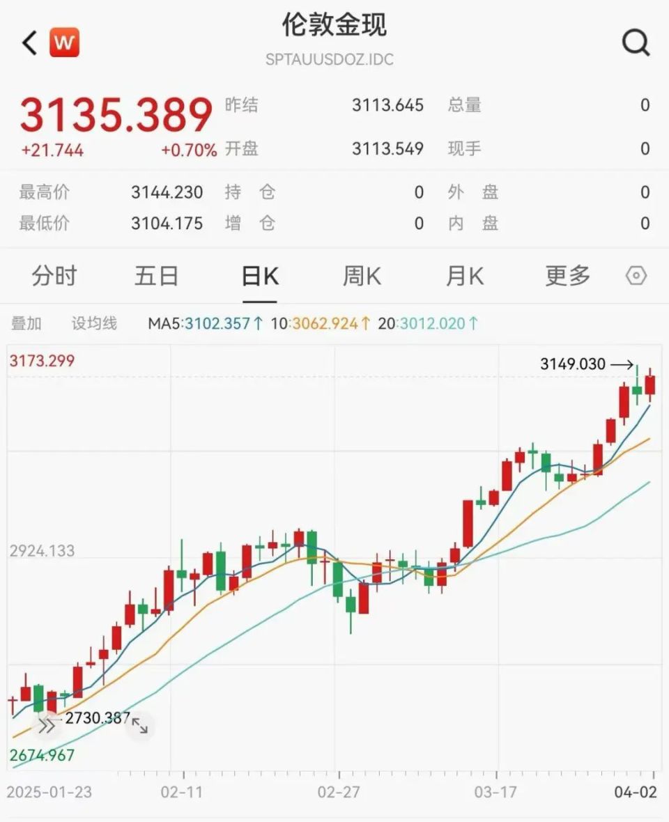 现货黄金上涨0.7%至3135.39美元/盎司。