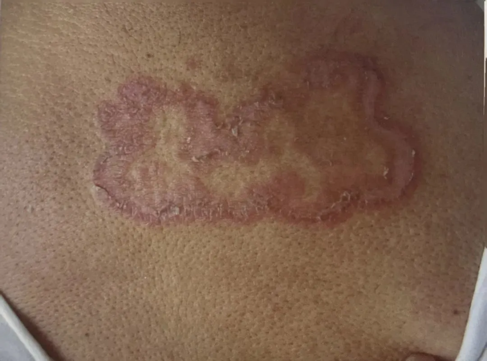 股癣:发生于腹股沟、会阴、肛周、臀部浅表皮肤。