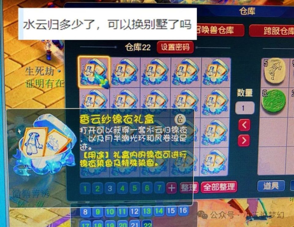 在现在梦幻西游所有囤积限量锦衣和限量祥瑞礼盒的那些商人中,最惨的应该就是当初囤积了水云归锦衣礼盒的那部分商人吧。现在水云归锦衣礼盒都需要半价来出售了,而且半价都不一定能够卖掉,当初囤积水云归锦衣礼盒的那部分玩家所做的梦是两三年之后可以直接换别墅,现在别说是换别墅了,连自己的房子都保不住了。如果真的囤了二三十车的水云归锦衣,对方的损失能够达到十几个呢。