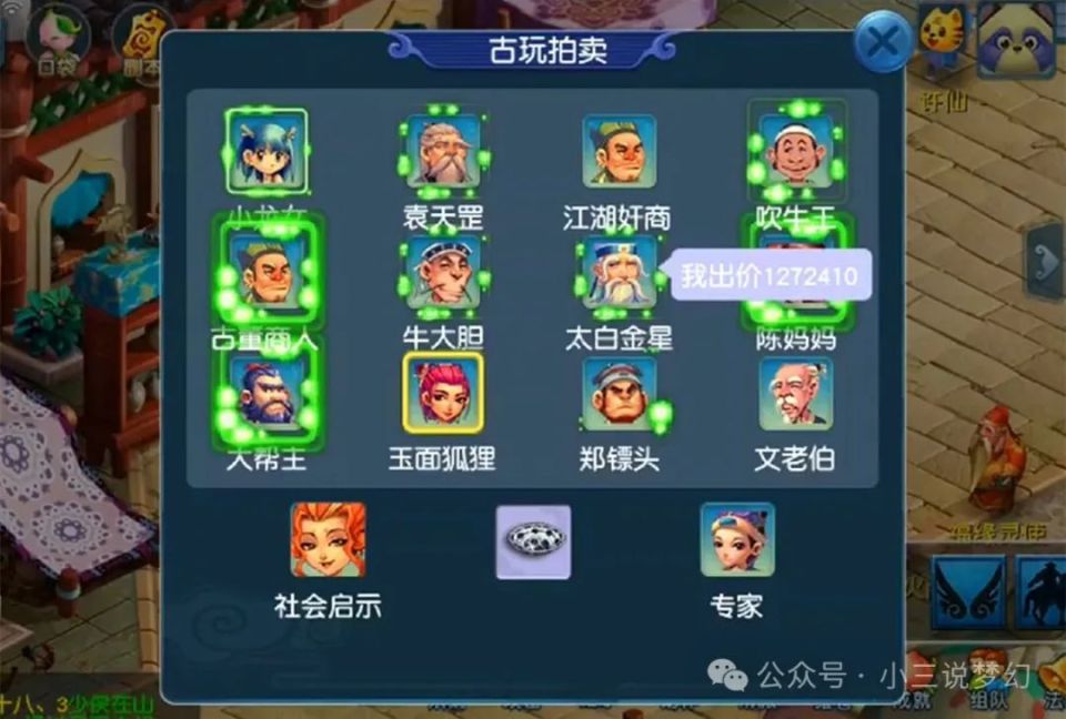 在梦幻西游中有一位玩法是10万梦幻币就能够参与一次,每次都有可能会获得10倍以上的收益,就比如上面的这位玩家,上面这位玩家现在就能够直接获得127万的梦幻币的奖励,该玩法就是位于宝象国古董老板那里的古董盘子拍卖玩法,大家花费10万梦幻币就能够买一个,拍卖的时候就有可能会获得大量的梦幻币,不过有的时候也会被强盗抢,也会被专家责难,所以在该玩法中亏钱的要比赚钱的多。