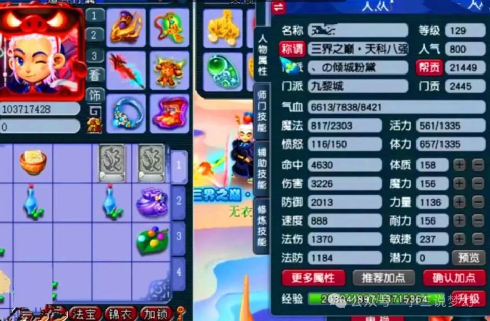 看到上面的这个角色了吗?上面是一个129级九黎城的角色,上面的这个129级的九黎城目前拥有着3226的面板伤害,2013的防御属性,甚至连气血属性也达到了8421,上面的这个九黎城的面板属性之所以会这么的全面,是因为上面的这个九黎城玩的不是影精灵,而是玩的单持武器的九黎城,上面的这种九黎城的面板属性要更完美一点,有输出也会有抗性。