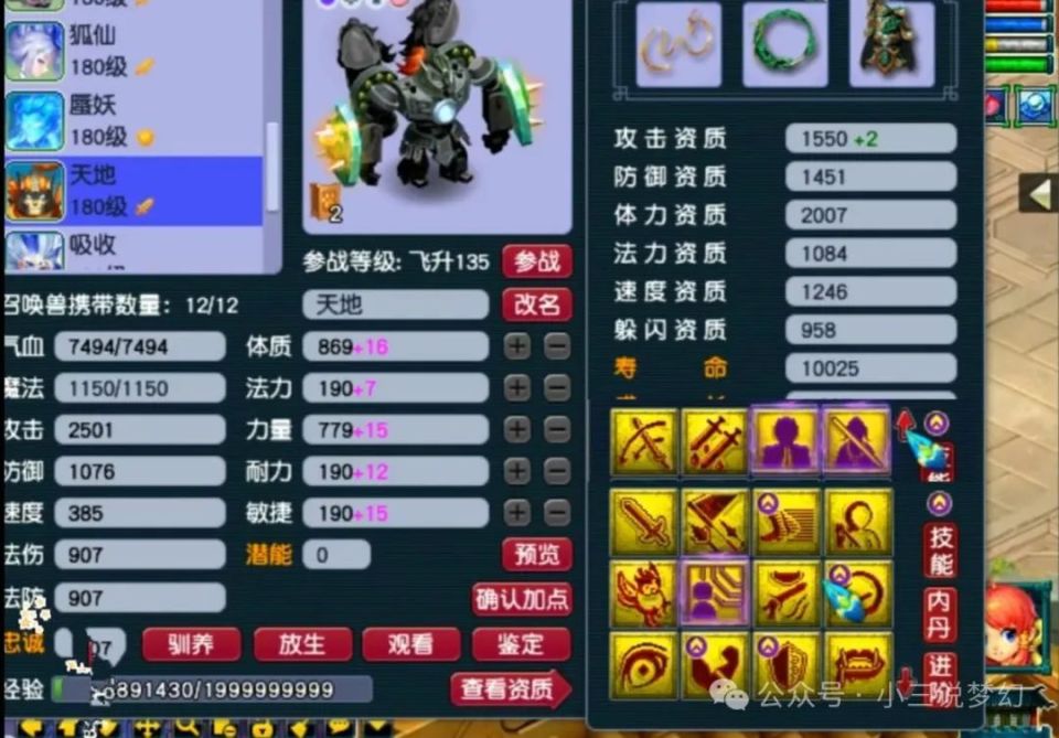 上面是一只拥有着12个技能的机关人,上面的这个机关人可以说是梦幻西游中仅有的存在,这只16技能的机关人打上去了三本超级魔兽要诀,这里面就包括超级否定信仰,再加上4赐福的技能,上面的这只召唤兽进入战斗以后最多能够同时触发5个超级技能。能够增加百分百的气血和75%的伤害。届时的气血属性能够达到1.5万。面板攻击甚至能够达到4000左右。不过上面这种召唤兽的打造成本也很高,要比服战召唤兽的打造成本还高。